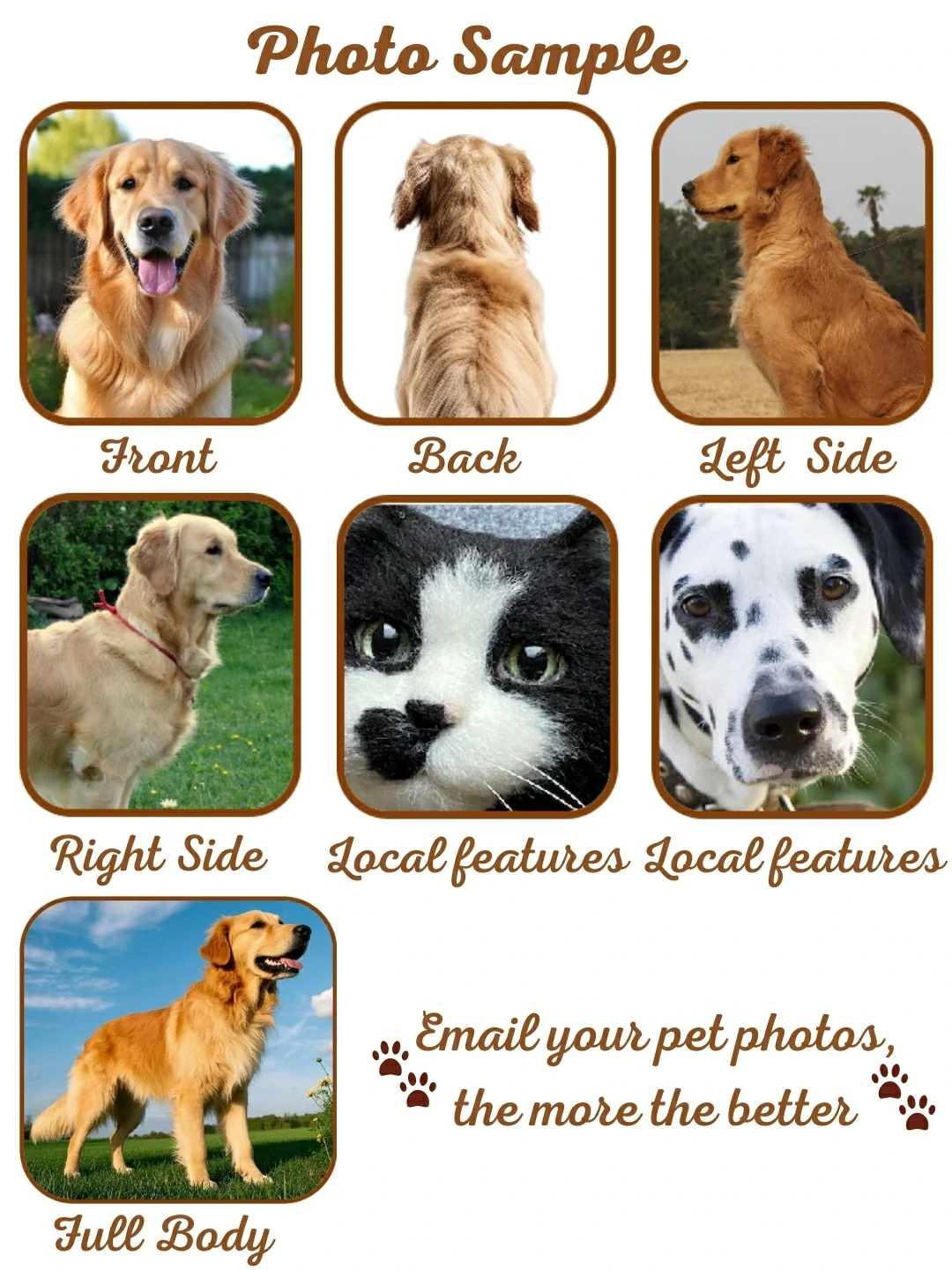 We can only meet your pet through the photos you provide, so please make sure the photo catches the real fur color and its unique features. We want to create the most accurate representation of your beloved pet, so please provide us with the best quality photos of your pet to help us make you satisfied.